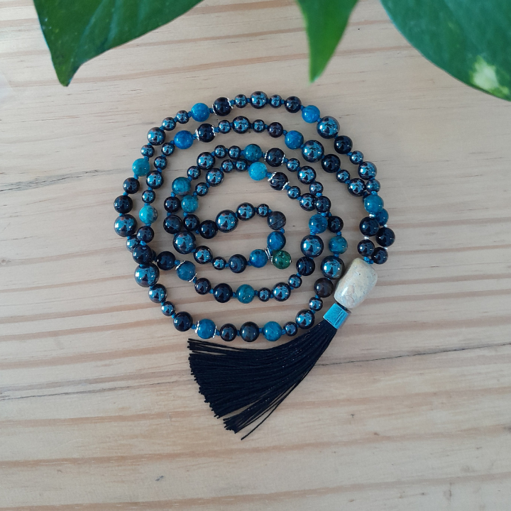 Um japamala com jaspe mesclada, granada, ágata preta, apatita e hematita reúne as energias de diversas pedras poderosas, criando um amuleto multifacetado com uma ampla gama de benefícios:
