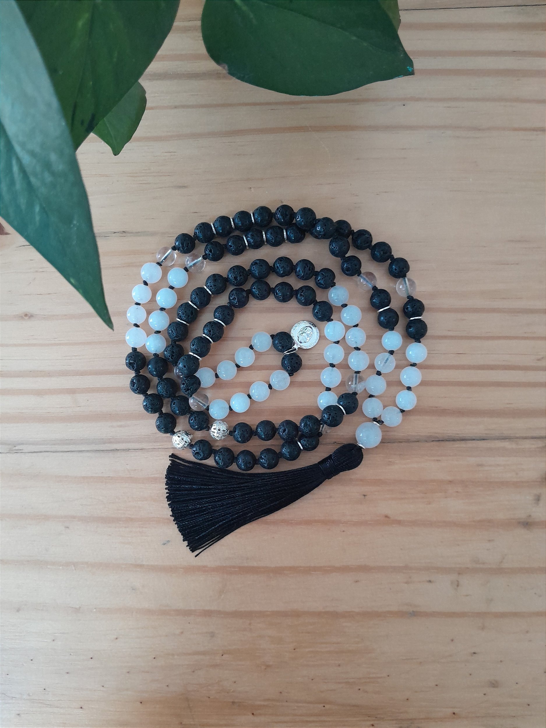 Japamala Pedra Vulcânica, Jade Branco e Cristal de Rocha - Amuleto de Equílibrio e Paz Interior
